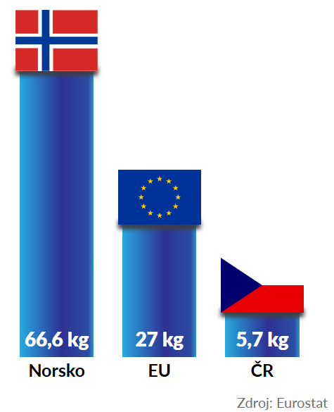 Did you know that Czechs eat 78% less fish on average than the rest of Europe? Compared to Norway, it’s 12 times less! In Norway, favorites like salmon and mackerel are staples. The true fish champions of Europe are Icelanders, eating an incredible 90 kg of fish per year!